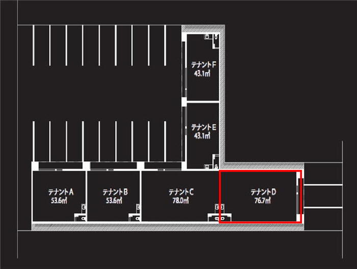 | 出店可能業種 | テイクアウト・物販・事務所・クリニック・エステ・マッサージ(飲食不可) |